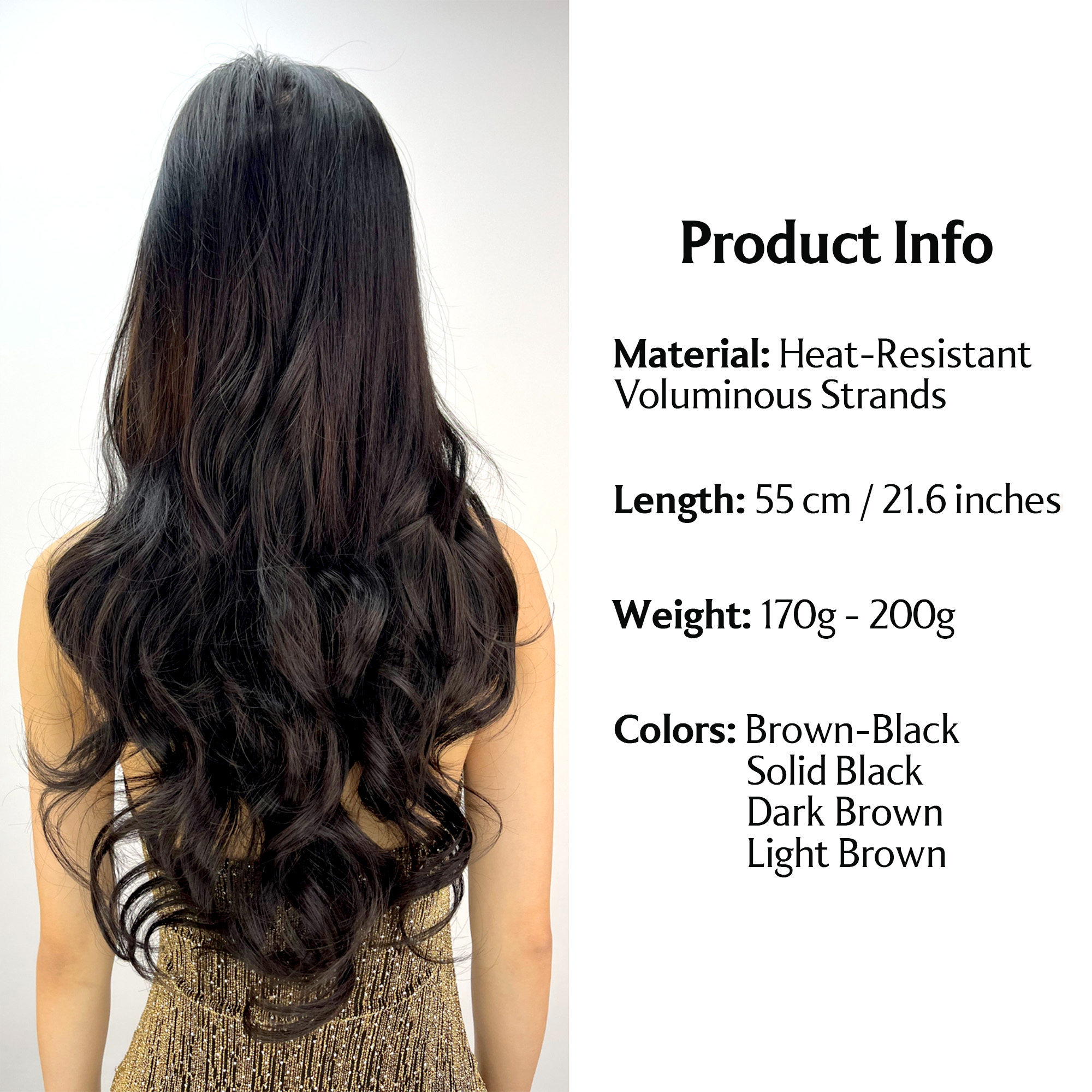 Crafted from premium, heat-resistant synthetic fibers, it feels luxuriously soft, styles easily, and holds its shape through long wear. The secure clip-in system blends effortlessly with your hair, delivering instant volume and graceful definition in minutes.